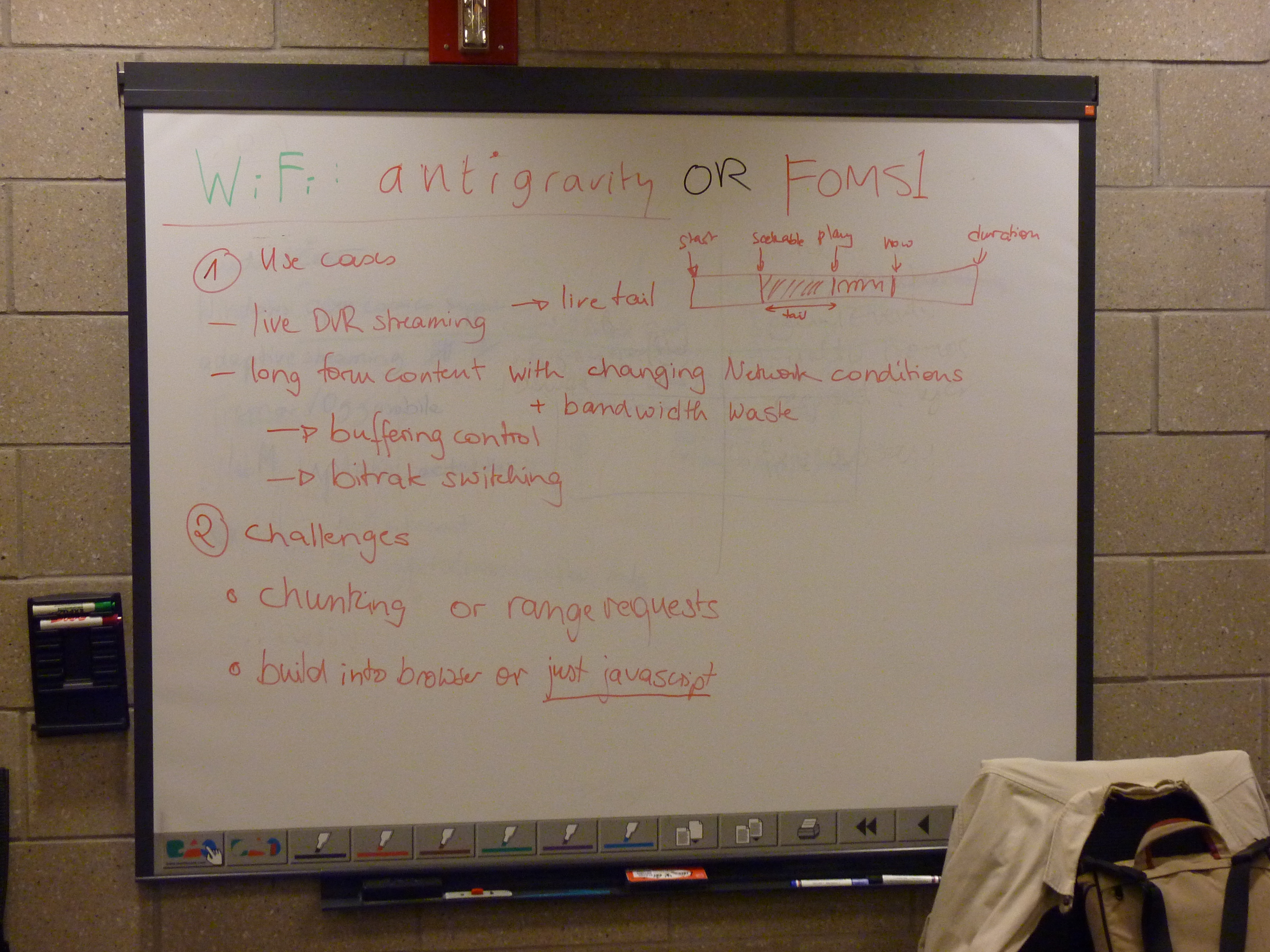 * Do we chunk? Do we range request seek? * Build it into the browsers or completely expose it to JS? (JS frameworks build it on top of browser changes) * Build logic into browser or just do JS?